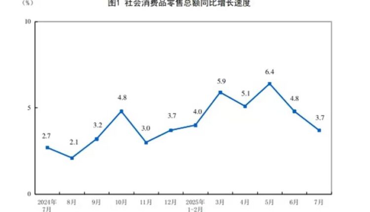 چین  کی صارفی اشیاء کی کل خوردہ فروخت میں جولائی میں پچھلے سال کی اسی مدت کے مقابلے میں  3.7 فیصد اضافہ ریکارڈ