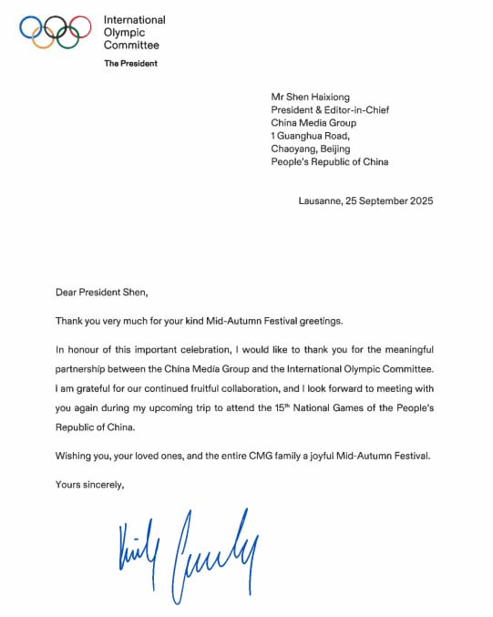 بین الاقوامی اولمپک کمیٹی کی صدر سیورین کووینٹری نے چائنا میڈیا گروپ کو ایک تہنیتی خط ارسال کیا، جس میں انہوں نے سی ایم جی کے تمام ملازمین کو وسط خزاں تہوار کی مبارکباد پیش کی۔